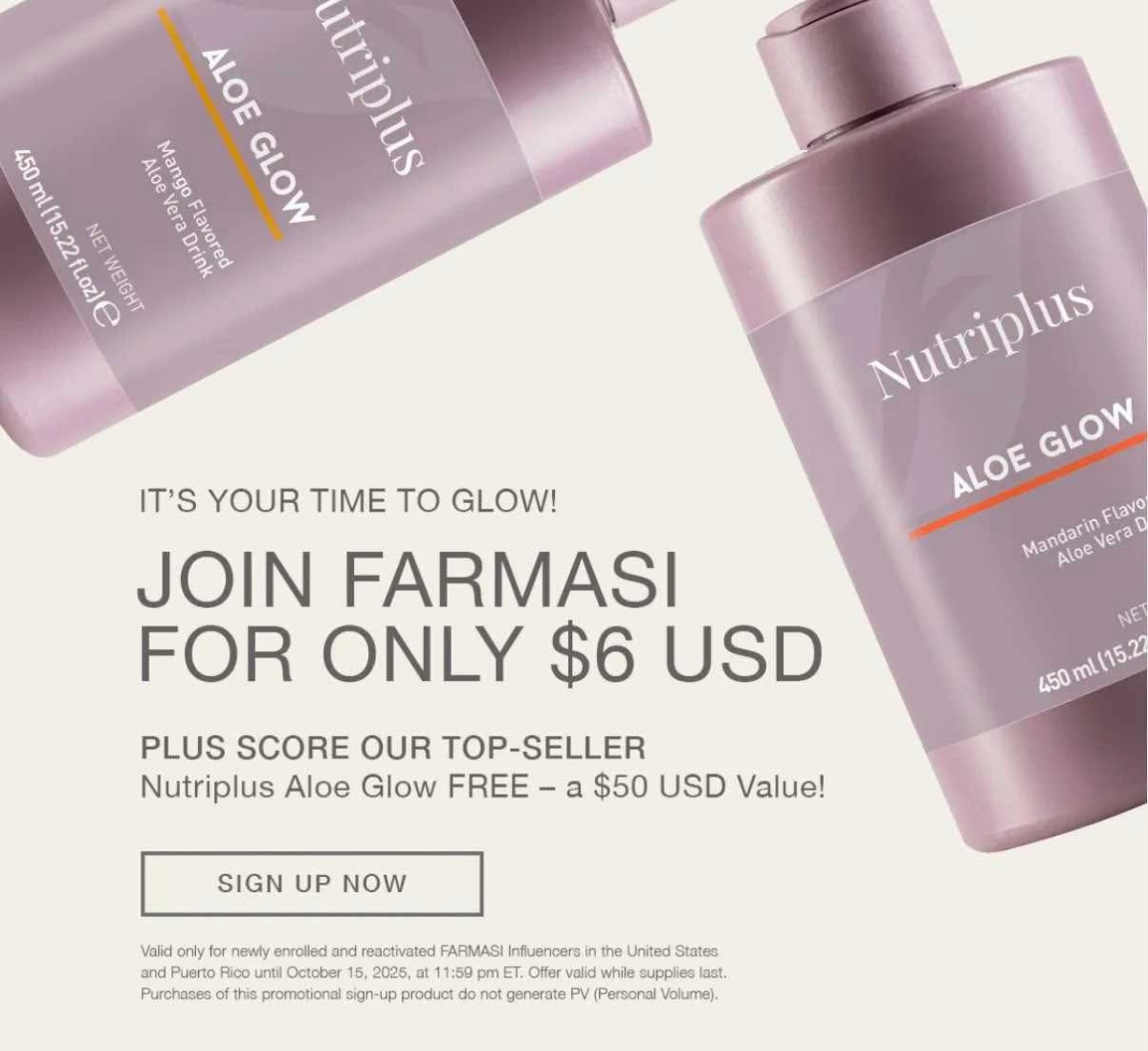 For a limited time, you can become a Farmasi influencer for only $6.00. Sign up before October 14 2025 and you'll also receive a FREE Nutriplus Aloe Glow, valued at $50. Sign up today!
